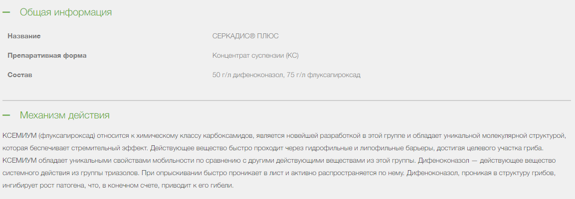 СЕРКАДИС ПЛЮС обладает профилактическим и лечебным действием. Но наибольшую эффективность фунгицид проявляет при профилактическом применении, поэтому для обеспечения эффективной защиты фунгицид СЕРКАДИС ПЛЮС необходимо применять до проявления первичных признаков инфекции.